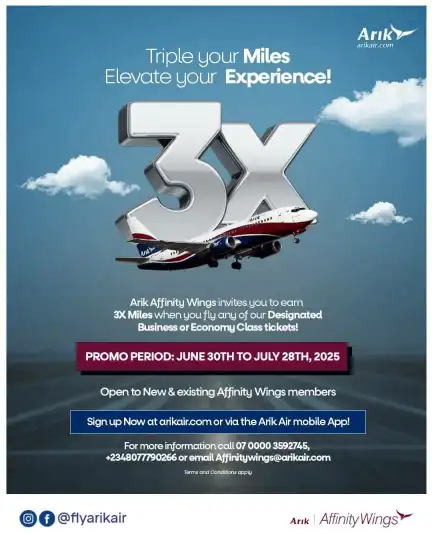 Arik Air has unveiled an exciting offer for its customers under the popular Frequent Flyer Program, the Arik Affinity Wings. The airline announced the Triple Miles Bonus Promotion, giving members the chance to earn three times more miles on their flights.