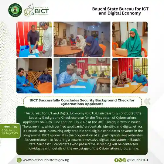 The Bureau for ICT and Digital Economy (BICTDE) has completed the Security Background Check exercise for the first batch of Cybernations applicants. The verification process took place on 30th June and 1st July 2025 at the BICT Headquarters in Bauchi.