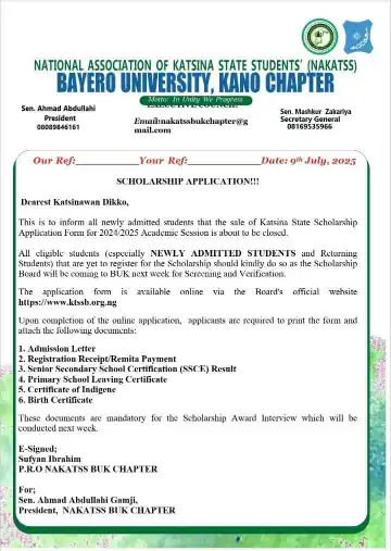 The National Association of Katsina State Students (NAKATSS), Bayero University Kano (BUK) Chapter, has called on newly admitted and returning students to urgently apply for the Katsina State Scholarship for the 2024/2025 academic session.