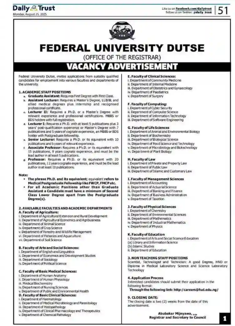 August 25, 2025 – Federal University Dutse has announced massive recruitment, and is inviting applications from suitably qualified candidates for employment into various faculties and departments of the university.